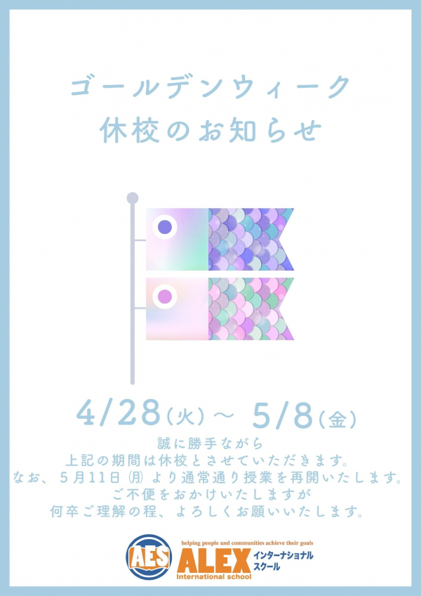 ★GW休校期間についてのお知らせ★ 2026.04.16 ALEXインターナショナルスクールでは、 年間カレンダーの通り、下記の期間中はすべてクラスを休校とさせて頂きます。 休校期間 4/28(火)~ 5/8(金) 休校期間中はお電話での対応ができませんので、ご了承くださいますようお願い申し上げます。 また、メールにつきましても返信までにお時間を頂戴する場合がございます。 ご質問等がございましたら、休校期間外にご連絡いただけますと幸いです。 ご不便をおかけし申し訳ございません。 何卒よろしくお願い申し上げます。 1234567891011121314151617181920
