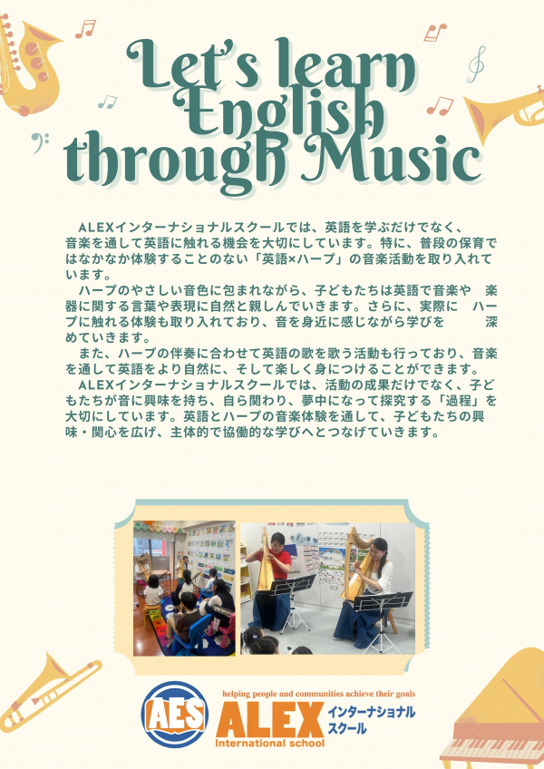 Let's learn English through Music! 2026.04.27 ALEXインターナショナルスクールでは、英語と音楽を組み合わせた活動を行っています。 ハープのやさしい音色に触れながら、子どもたちは英語にふれています。。 音楽を通して、表現する楽しさや感性を育むことを大切にしています。 また、子どもたちの興味・関心を広げ、主体的で協働的な学びへとつなげています。 今後も、さまざまな体験を通して豊かな学びの環境づくりに努めてまいります。 ★GW休校期間についてのお知らせ★ 2026.04.16 ALEXインターナショナルスクールでは、 年間カレンダーの通り、下記の期間中はすべてクラスを休校とさせて頂きます。 休校期間 4/28(火)~ 5/8(金) 休校期間中はお電話での対応ができませんので、ご了承くださいますようお願い申し上げます。 また、メールにつきましても返信までにお時間を頂戴する場合がございます。 ご質問等がございましたら、休校期間外にご連絡いただけますと幸いです。 ご不便をおかけし申し訳ございません。 何卒よろしくお願い申し上げます。 1234567891011121314151617181920